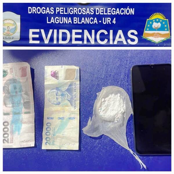 Efectivos de la Delegación Drogas Peligrosas de Laguna Blanca detuvieron a un hombre, de 29 años, secuestraron cocaína y una motocicleta Keller Crono Classic.