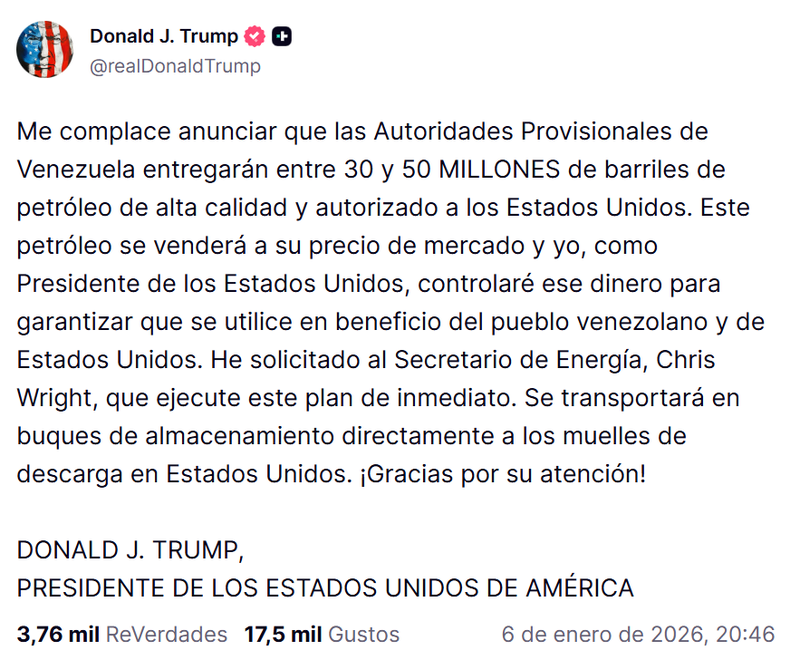 Mediante una publicación en su cuenta oficial de Truth Social, el presidente norteamericano aseguró que «este petróleo se venderá a precio de mercado y controlaré ese dinero para garantizar que se use en beneficio del pueblo venezolano y de Estados Unidos».
