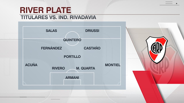 - River: Franco Armani; Gonzalo Montiel, Lucas Martínez Quarta, Lautaro Rivero, Marcos Acuña; Kevin Castaño, Juan Carlos Portillo, Fernández; Juan Fernando Quintero; Maximiliano Salas y Sebastián Driussi. DT: Marcelo Gallardo.