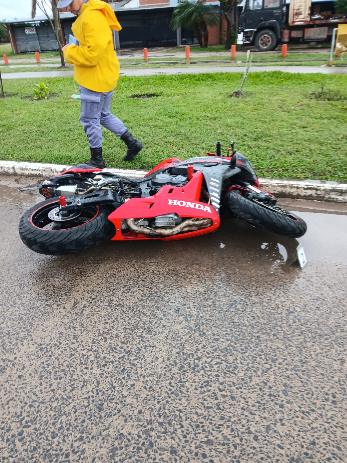 Por causas que se tratan de establecer, se produjo la colisión entre ambos vehículos, lo que provocó que el motociclista pierda el control, caiga y sufra lesiones y pérdida del conocimiento.